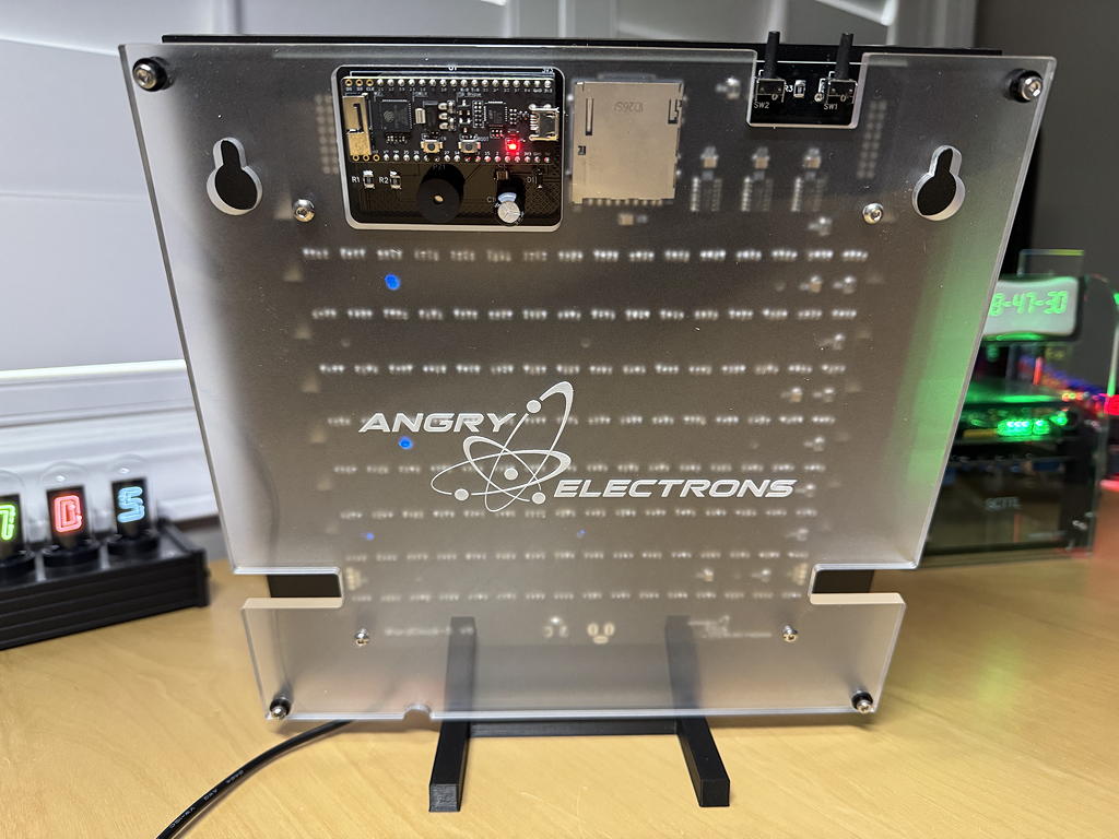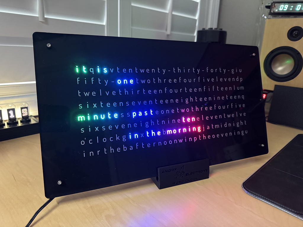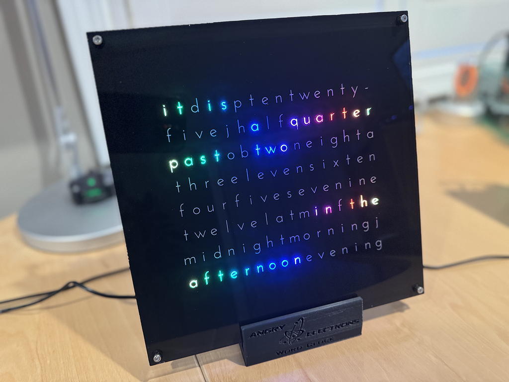 The clocks are very bright and like the other word clocks by Angry Electrons are initially setup through a WiFi portal via any web browser. There are a number of different animations that can be selected (or cycle through them all!) and also different color palettes. These are also changeable manually with two push buttons at the rear of the clock. The display can be also dimmed at set time intervals and DST is automagic!